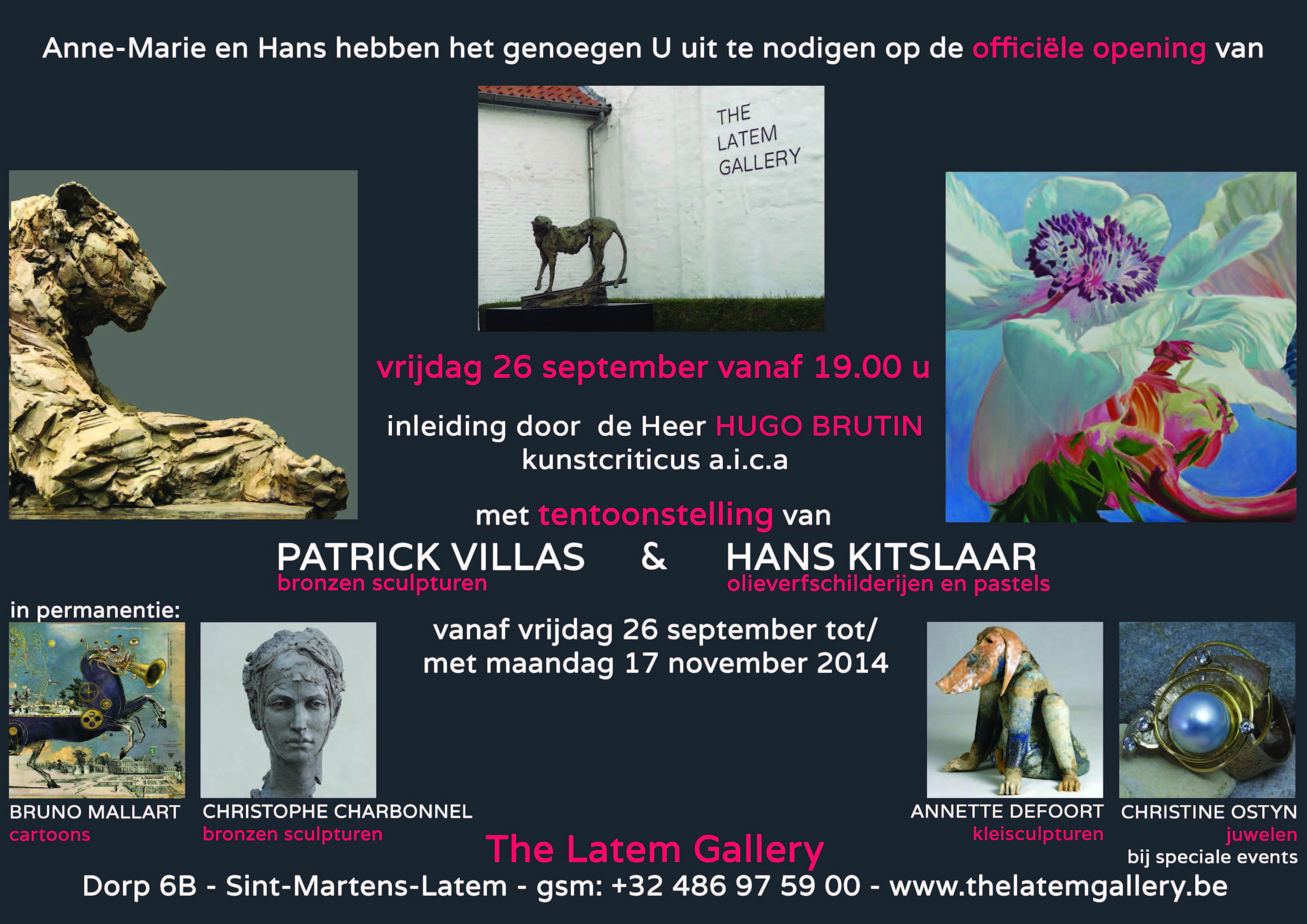 Sinds augustus dit jaar was de nieuwste aanwinst ‘The Latem Gallery’ aan het proefdraaien en nu opent dit nieuw trefpunt voor beeldende kunsten officieel haar deuren op vrijdag 26 september.Hieronder de uitnodiging voor de officiële opening van de galerie in Sint-Martens-Latem op vrijdag 26 september vanaf 19 uur met een tentoonstelling van bronzen van Patrick Villas, schilderijen van Hans Kitslaar en kleisculpturen van Annette Defoort (expo van 26 september tot/met 17 november 2014).