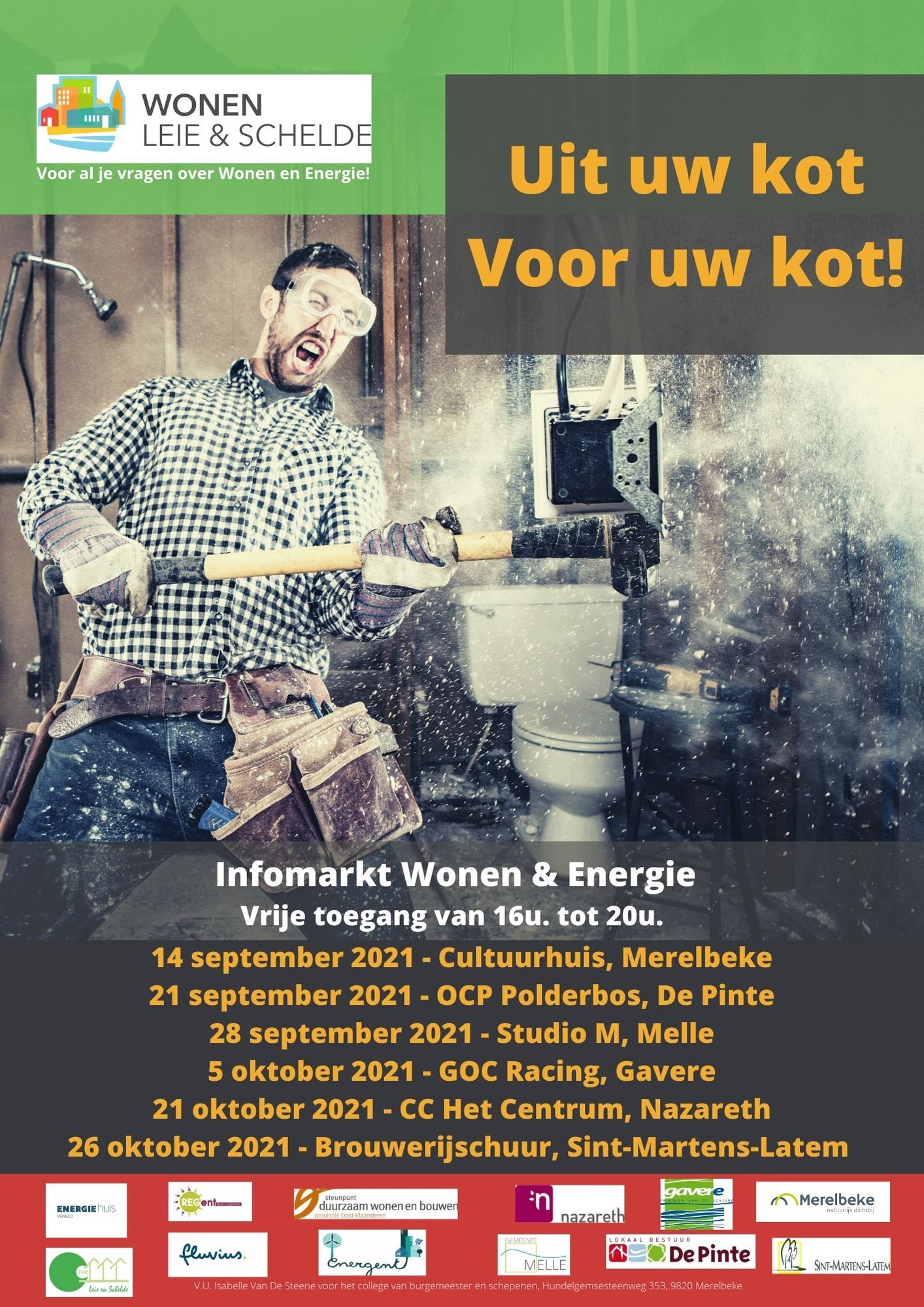 Met de campagne ‘Uit uw kot voor uw kot’ wil Wonen Leie en Schelde haar woon-en energieloketten nog eens extra promoten. Daarom organiseert de vereniging in elke aangesloten gemeente een infomarkt om de burger te informeren over alles wat te maken heeft met wonen, huren, (ver)bouwen, energiezuinige investeringen, premies en contracten. In Sint-Martens-Latem vindt de infomarkt plaats op 26 oktober 2021, doorlopend van 16 tot 20 uur, in de Brouwerijschuur (Dorp 24, Sint-Martens-Latem).