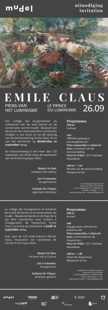 Als eerbetoon aan de belangrijkste impressionist van ons land, start in het ‘MUDEL’ de prestigieuze tentoonstelling “Emile Claus. Prins van het luminisme” die de tientallen topwerken van de kunstenaar samenbrengt. De titel van de tentoonstelling is geïnspireerd op een publicatie van Alice Sauton uit 1946. Uit alle periodes van zijn oeuvre worden de mooiste schilderijen getoond, mede dankzij de uitzonderlijke samenwerking met het Museum voor Schone Kunsten van Gent én via belangrijke bruiklenen uit diverse publieke en private collecties.