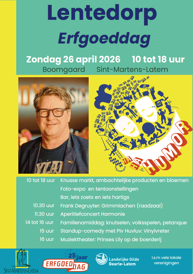 Op zondag 26 april 2026 staat Sint-Martens-Latem opnieuw in het teken van sfeer en ontmoeting tijdens het jaarlijkse Lentedorp. Dit jaar wordt het evenement weer gekoppeld aan Erfgoeddag, die volledig in het teken staat van humor.