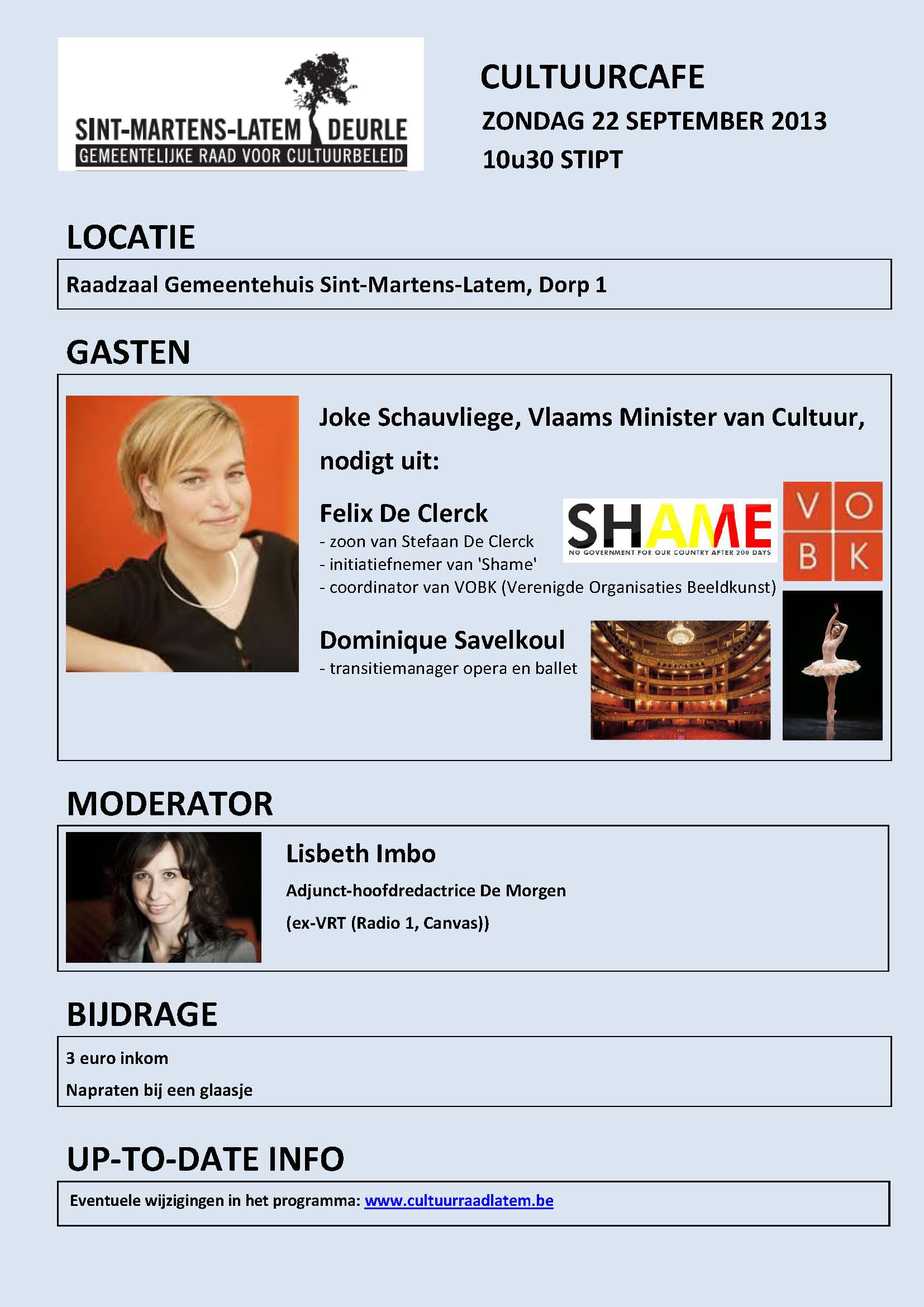 Op 22 september 2013 komt Minister Joke Schauvliege naar het Cultuurcafé waar ze de gaste is van de Gemeentelijke Culturele Raad in de Raadzaal van de Gemeente.